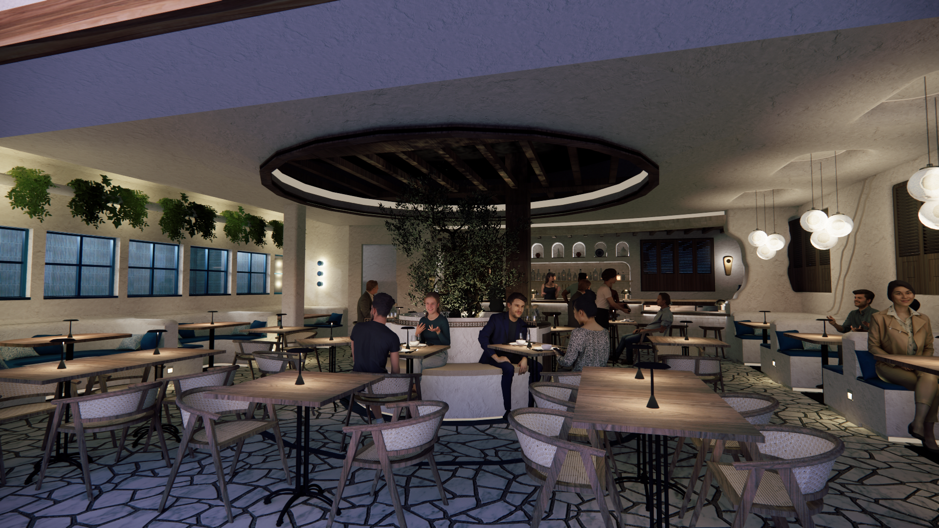 The design is driven by a philosophy of simplicity—walls of hand-troweled plaster catch shifting light, while sculpted niches and built-in banquettes carve moments of intimacy within the open plan. Textured limestone floors ground the space, complemented by warm, weathered wood elements that add a sense of depth and history. The interplay of natural materials and soft, curvilinear forms evokes the essence of the Mediterranean, reinterpreted through a contemporary lens.